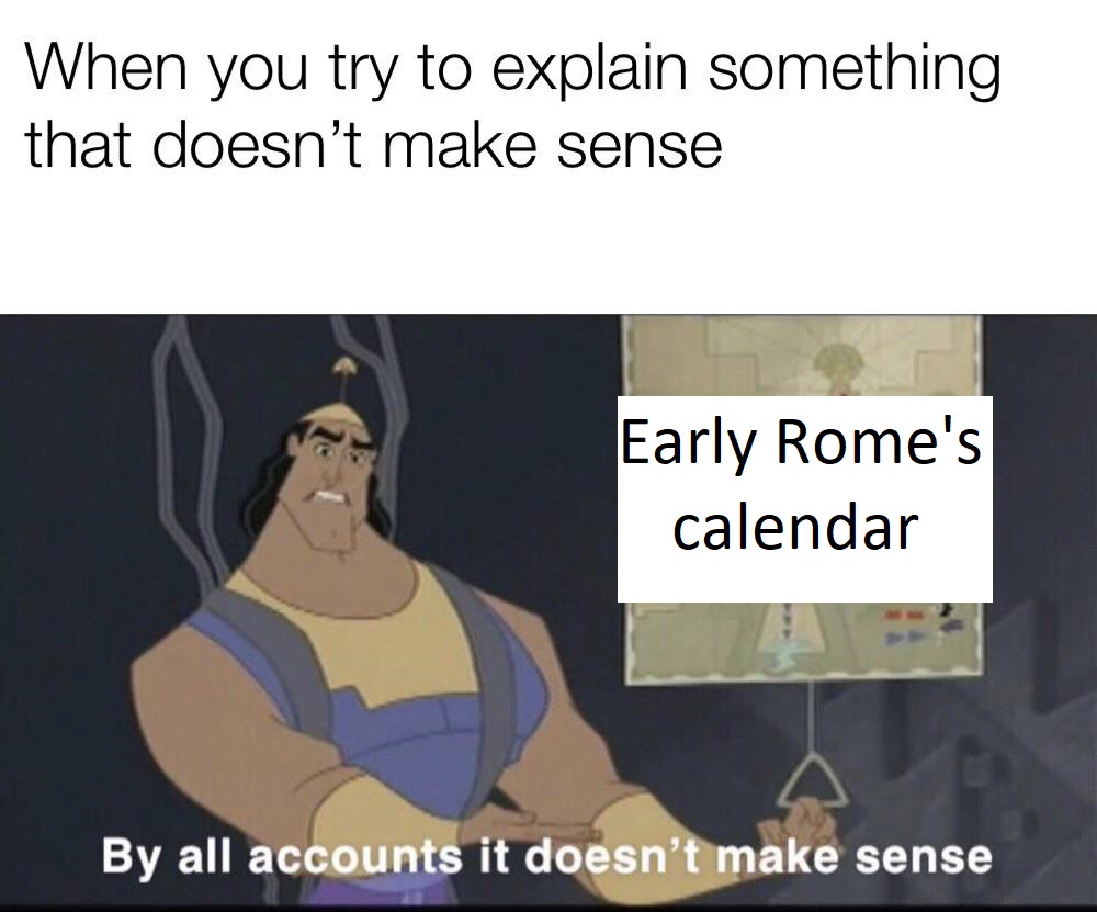 Perhaps the strangest of all the calendars in the area, however, was that of the early Roman Empire. Some months, like Maius and Iunius, they named after gods. Others, like September and November, basically just meant Seventh Month and Eight Month, and there wasn’t much consistency between the day counts in the months. Stranger still was the winter gap, in which there seemingly existed no month at all for 50+ days. Romulus, you’re a cool king and all for founding Rome, but what was with that time gap in your calendar?