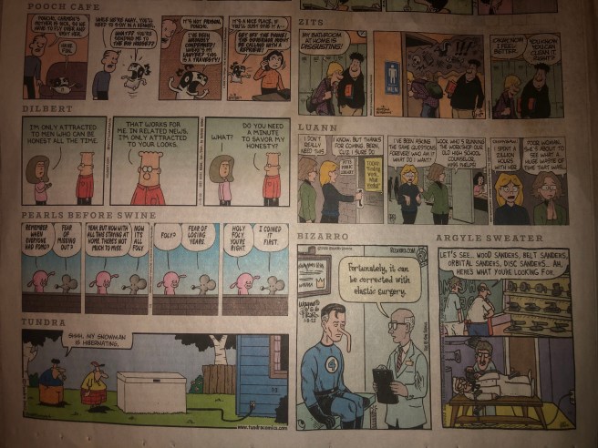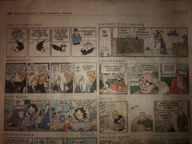 The following is an experimental erasure-style poem, formed entirely from fragmented quotes in the 1/3/2022 edition of the Edmonton Journal’s comic section (original at the bottom). All 20 comics are represented in some fashion, though some are more prominent than others, and the COVID pandemic (which was still ongoing at the time) definitely influenced the message of this piece as well.